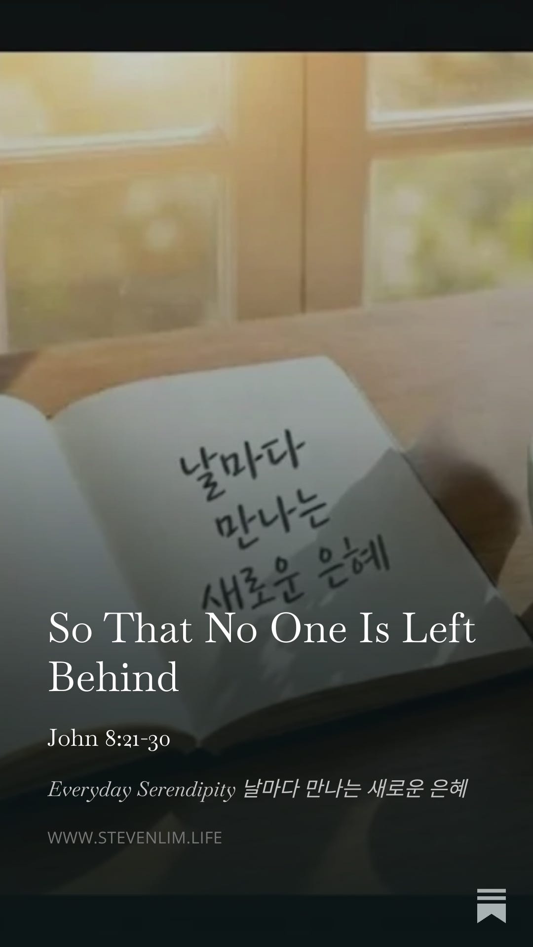예수 그리스도는 구세주이시다. 구원해주시는 분이란 뜻이다. 구세주는 구원이 필요한 사람에게는 너무나 절실한 은인이지만 스스로 구원이 필요하다는 것을 알지 못하거나 , 혹은 인정하지 않는 사람들에게는 전혀 매력적인 존재가 아니다. 하여 그들은 구세주가 아무리 부르고 청하여도 듣지 않는다. 주님께서 뒤에 버려두는 것이 아니라 그들이 끝끝내 은혜의 초대를 거절함으로 남겨지는 것이다. 그들이, “당신이 누구입니까?” 라고 물을 때마다 주님은 “내가 그”라고 답하신다(24, 28절. 새번역에는 “내가 곧 나다”라고 번역했으나 대부분의 다른 번역본은 “내가 그다(I am He)라고 번역한다). 당신께서 구세주 그리스도되심을 누누이 말하고 있지만 그들은 듣지 않았다.